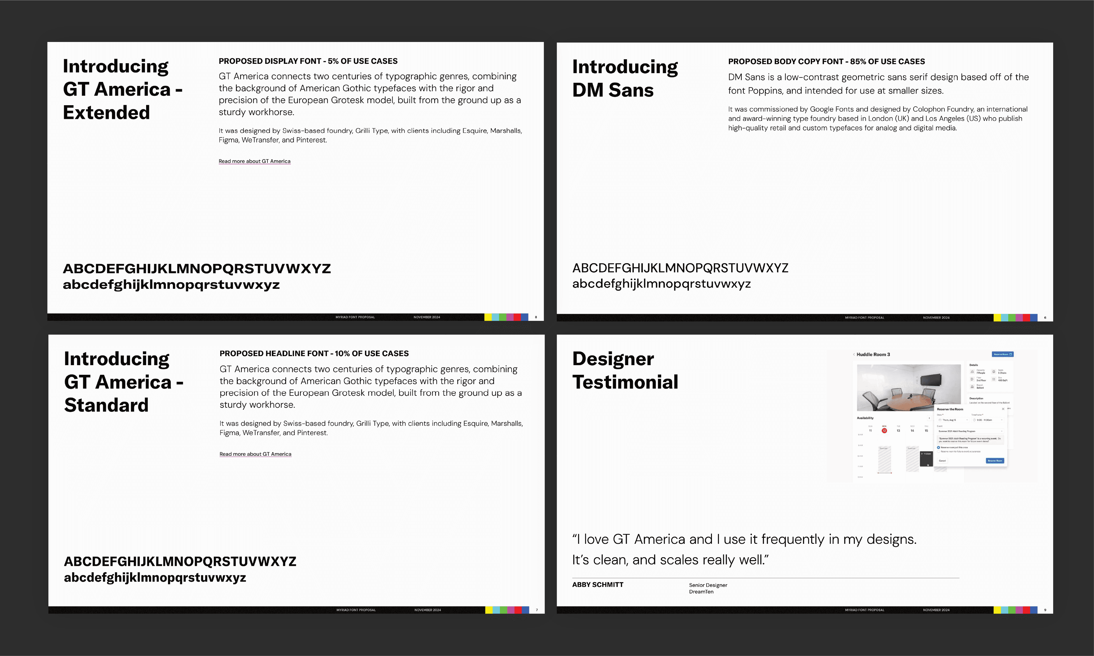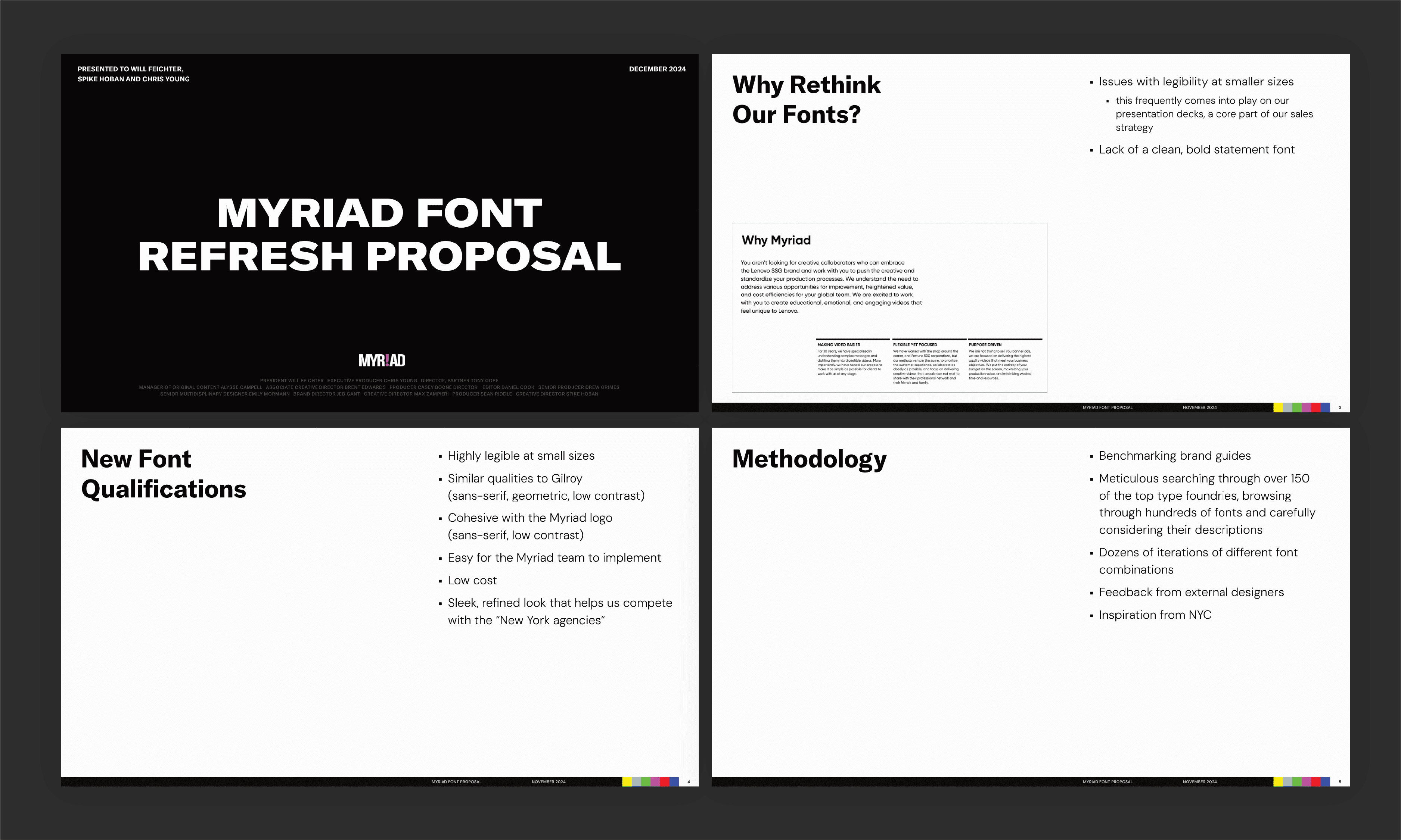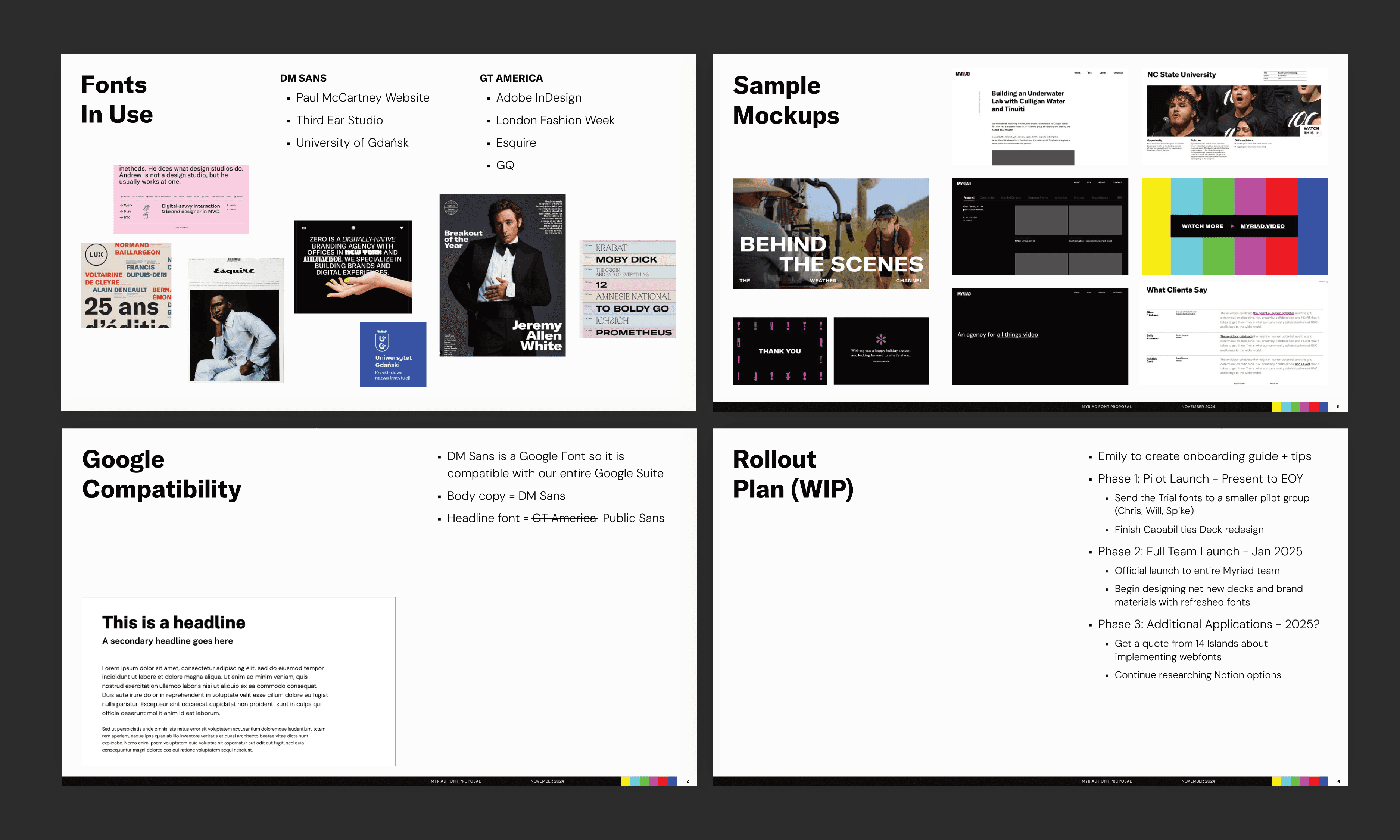 During my time at Myriad, I recognized the need for a sharp, well-designed capabilities deck that could be utilized by anyone on the team, and that coincided with a longstanding need to update the brand’s typographic system. I took the initiative to research hundreds of various fonts and propose a type refresh that aligned with our larger brand strategy. I then created a fresh Capabilites Deck template, supplemented with onboarding for my team and written instructions for use.
